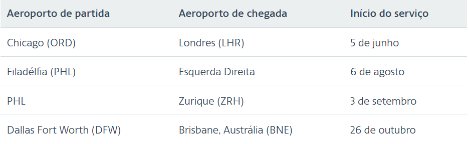 - O voo internacional inaugural oferecendo a experiência premium da Flagship Suite será em 5 de junho, de Chicago para Londres.