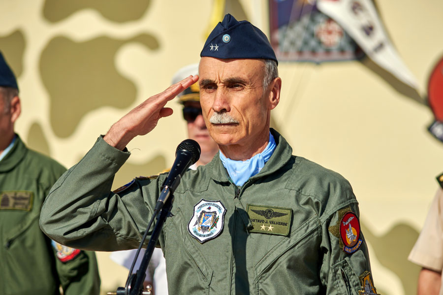 A seguir, o chefe do Estado-Maior General da Força Aérea Argentina expressou o orgulho que a Instituição e os instrutores da IV Brigada Aérea sentem em treinar e treinar os pilotos de combate da Instituição, o pessoal da Força Aérea Peruana, do Uruguai e a Marinha Argentina.
