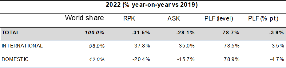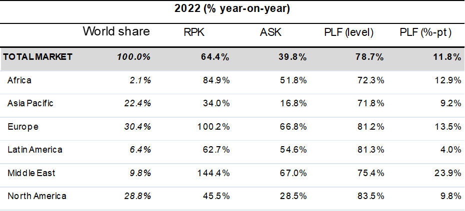 - O tráfego total de 2022 (medido em passageiro pagante por quilômetro, ou RPKs) aumentou 64,4% em comparação com 2021. Globalmente, o tráfego em 2022 ficou em 68,5% dos níveis pré-pandemia (2019). O tráfego total de dezembro de 2022 aumentou 39,7% em relação a dezembro de 2021 e atingiu 76,9% do nível de dezembro de 2019.