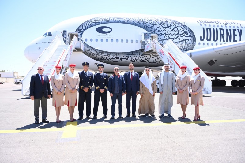 Os passageiros a bordo do primeiro A380 para o Marrocos estavam em um tom extra de emoção quando o superjumbo estava vestido com uma pintura especial marcada para a ocasião. A aeronave ostentava o Museum of the Future Livery, a mais nova maravilha definitiva de Dubai, ícone arquitetônico e centro de conceitos e ideias pioneiras.