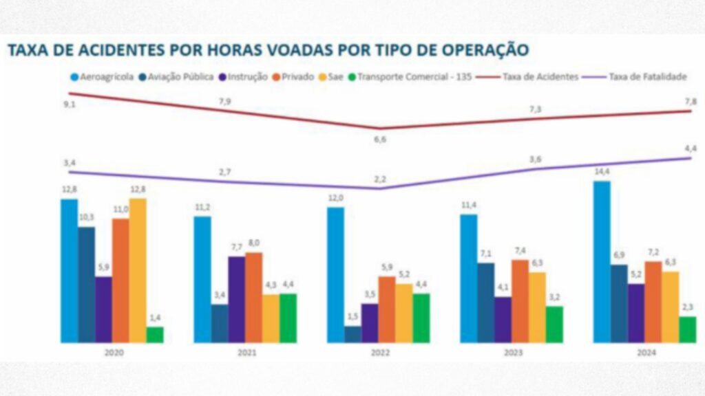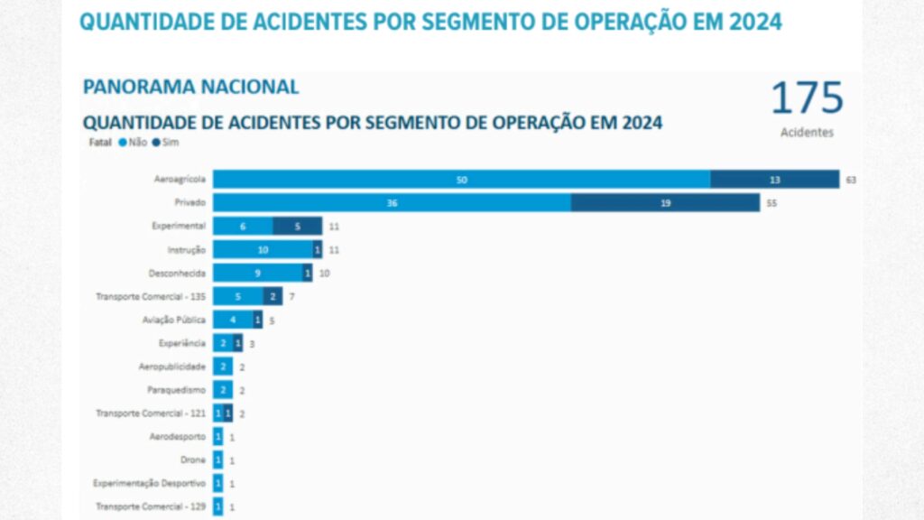 De acordo com o último Relatório Anual de segurança Operacional (RASO), referente a 2024, produzido pela ANAC, a aviação privada e agrícola lideram o ranking de acidentes no país. Juntas, essas duas modalidades concentraram mais de dois terços dos 175 acidentes registrados em 2024. A aviação agrícola registrou 63 acidentes, sendo 13 fatais, enquanto a aviação privada contabilizou 55 acidentes, dos quais 19 resultaram em mortes. Esses dois segmentos também apresentaram as maiores taxas de acidentes por 100 mil horas voadas: 14,4 na aviação agrícola e 7,2 na aviação privada.