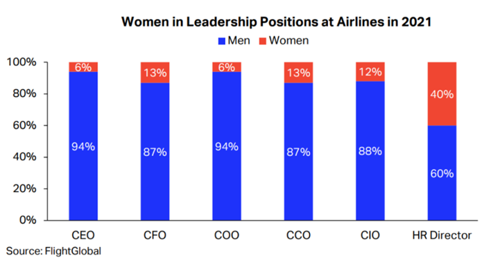 De acordo com uma pesquisa da Korn Ferry, apenas 6% das empresas aéreas têm uma mulher CEO, enquanto 5,1% dos pilotos são mulheres. Além disso, mulheres representam cerca de 26% dos controladores de tráfego aéreo, 18% dos despachantes de voo e menos de 9% dos engenheiros aeroespaciais.