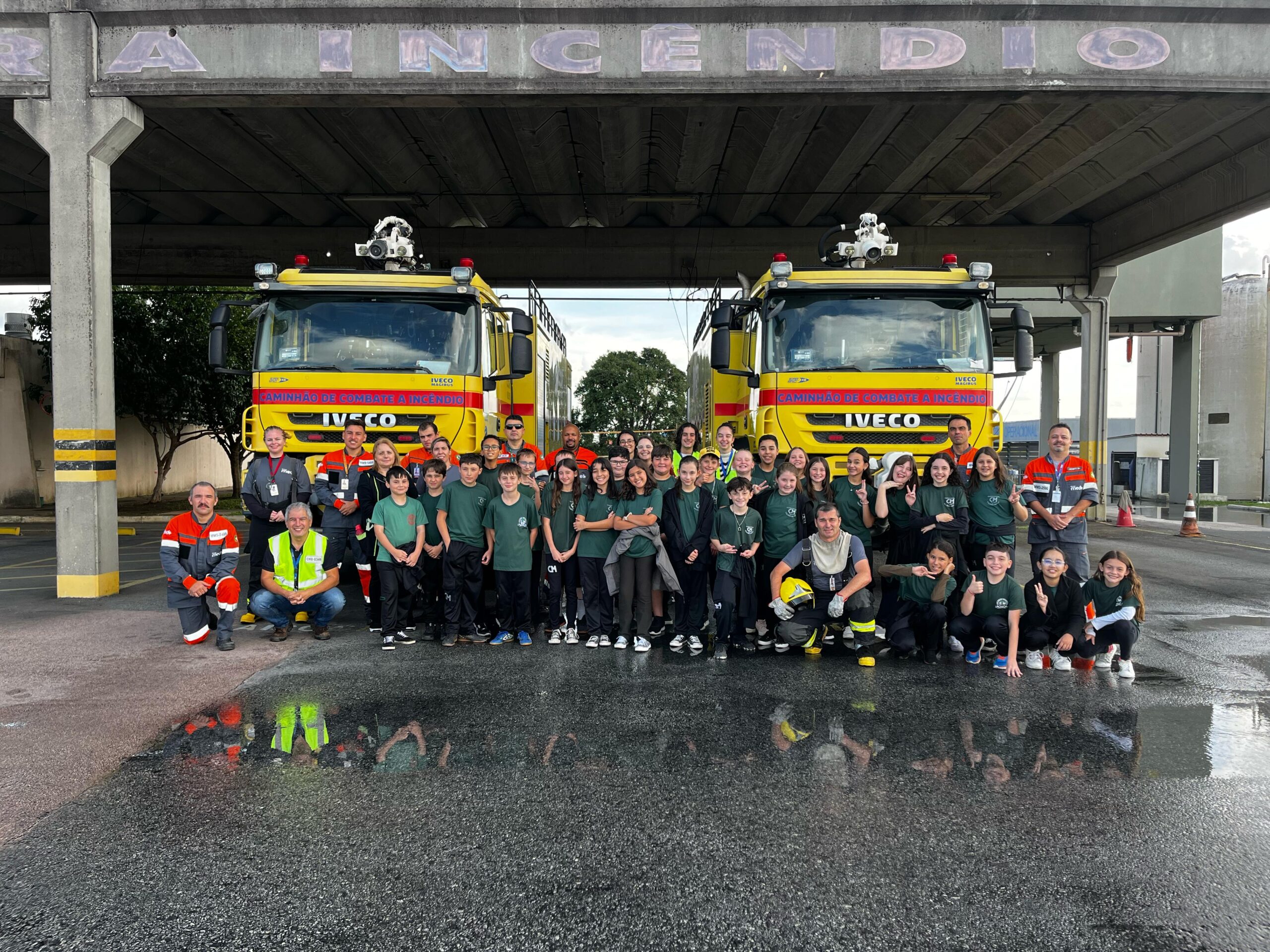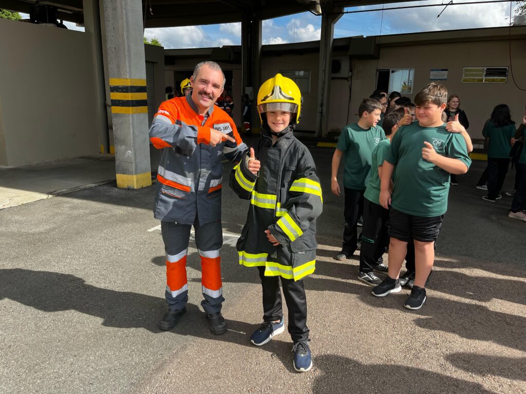 Um dos momentos mais marcantes do passeio foi a visita ao Corpo de Bombeiros de Aeródromo. As crianças ficaram encantadas com a estrutura da corporação, especialmente ao verem de perto o caminhão de combate a incêndios utilizado em emergências aeroportuárias. O som da sirene, a demonstração do potente jato d’água e a simpatia da equipe de bombeiros renderam sorrisos e olhares curiosos, tornando a experiência ainda mais inesquecível.