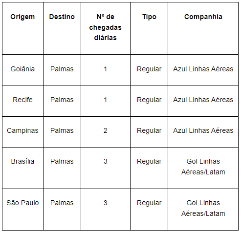 O Aeroporto de Palmas possui um leque de opções para os turistas de São Paulo, Goiânia, Recife, Campinas e Brasília. Os voos são regulares e operados pelas companhias aéreas Latam, Azul Linhas Aéreas e Gol Linhas Aéreas.