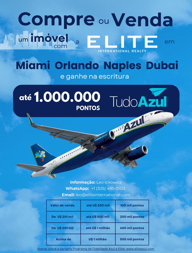 Os benefícios não se limitam ao setor de aviação, graças a um recente acordo entre a Azul e a Elite International Realty, consultoria imobiliária fundada por brasileiros que atua há mais de 30 anos no mercado internacional. Os clientes que comprarem ou venderem imóveis por intermédio dessa imobiliária, em Miami, Orlando e Naples, nos Estados Unidos, além de Dubai, nos Emirados Árabes Unidos, ganharão entre 100 mil e 1 milhão de pontos no programa