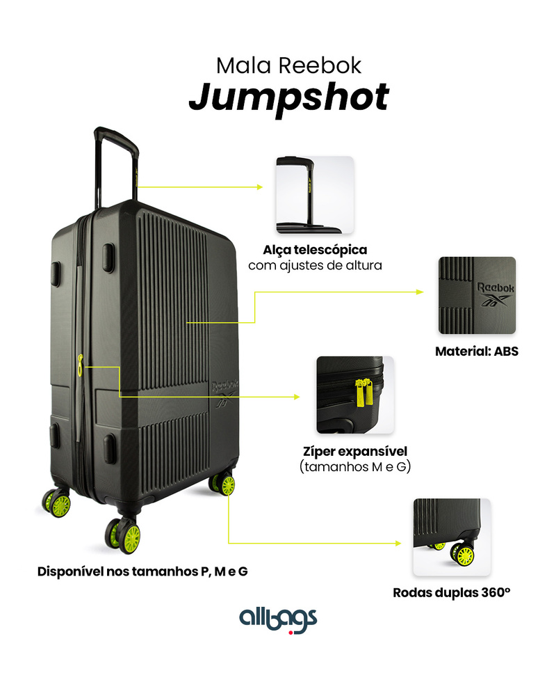 Já a linha JUMPSHOT é perfeita para quem busca praticidade sem abrir mão do estilo. Seu design moderno, aliado à estrutura leve e resistente, garante segurança e conforto em qualquer jornada. Com detalhes em neon e logotipo em alto-relevo, reforça o DNA esportivo da marca. Assim como a linha PLAYER, os modelos M e G contam com zíper expansível e rodas duplas 360º para maior mobilidade.