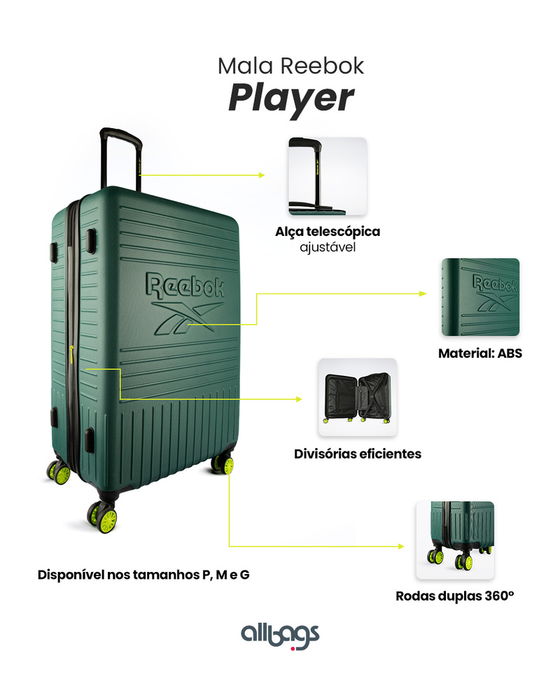 A Allbags, referência nacional em malas e mochilas, anuncia a chegada exclusiva das novas malas de viagem Reebok. Com mais de 130 anos de história, a marca é um ícone global do esporte e agora expande sua expertise para o universo das viagens, unindo estilo, funcionalidade e inovação em suas novas linhas: PLAYER e JUMPSHOT.