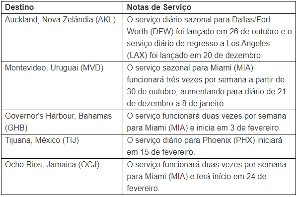 O serviço sazonal para Auckland, Nova Zelândia (AKL) foi retomado em 26 de outubro e para Montevidéu, Uruguai (MVD) em 29 de outubro.