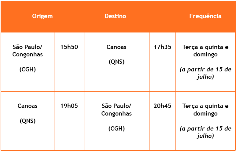 Canoas (QNS) – Porto Alegre – Terminal Salgado Filho a São Paulo/Congonhas (CGH): voos adicionais
