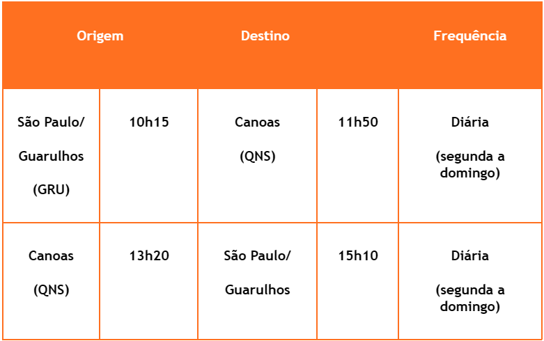 Canoas (QNS) – Porto Alegre – Terminal Salgado Filho a São Paulo/Guarulhos (GRU): em operação desde 1º/06/2024