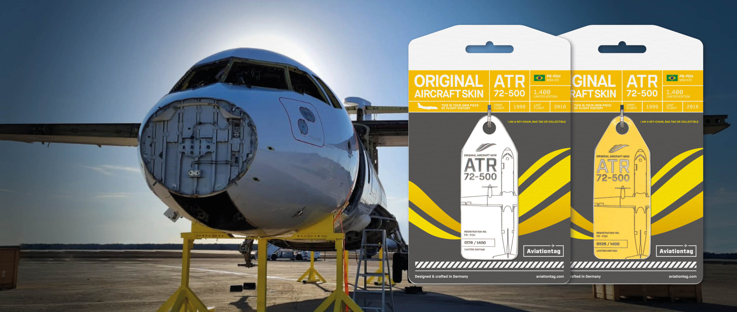 Desde 2006, retiramos peças originais de aviões e do que antes eram aviões da vida real e as transformamos em itens premium e exclusivos de designer e colecionador. Em 2015, tivemos a ideia de fazer o mundo um pouco melhor ao reciclar aviões sucateados em nossas etiquetas especiais de aviação. Ao lado de aviões comerciais como o Boeing 747 ou o Airbus A340, também demos uma segunda vida a aeronaves históricas como o “Candy Bomber” DC-3 como Aviationtag. Mas isso também nos permite preservar partes importantes e interessantes da história da aviação. O vídeo abaixo dá uma ideia de como funciona o processo de produção da aeronave até o Aviationtag. Saiba mais sobre a história e os produtos a qualquer momento em nossas redes sociais e em nosso blog .
