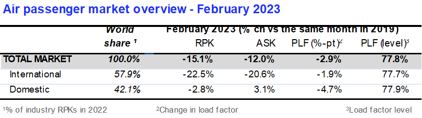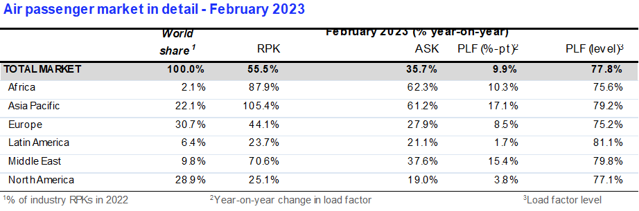 - O tráfego total de fevereiro de 2023 (medido em passageiro pagante por quilômetro, ou RPKs) aumentou 55,5% em comparação com fevereiro de 2022. Globalmente, o tráfego atingiu 84,9% dos níveis de fevereiro de 2019 (pré-pandemia).