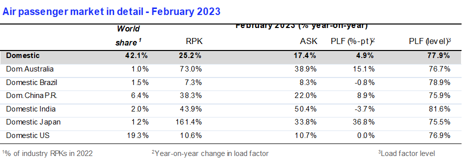- O tráfego doméstico de fevereiro de 2023 aumentou 25,2% em comparação com o mesmo período do ano anterior. O tráfego doméstico total de fevereiro de 2023 atingiu 97,2% do nível de fevereiro de 2019.