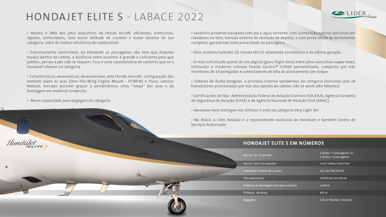 Entre os principais destaques do aquecimento deste mercado está a área de vendas: “no mercado brasileiro, houve um aumento de 150% nas transações de compra e venda tanto de aeronaves novas como de seminovas em relação ao período pré-pandemia – e agora teremos a primeira Labace depois deste crescimento expressivo”, aponta Anderson Markiewicz, diretor de Vendas de Aeronaves da Líder Aviação. “Será uma ótima oportunidade para os interessados avaliarem as aeronaves de perto e conhecerem melhor nossos serviços de consultoria e assessoria na aquisição e vendas de aeronaves, além de reforçarmos nossa experiência e conhecimento de diversos fabricantes, no caso de aeronaves seminovas”, complementa Markiewicz. Durante o evento, a Líder Aviação, que é representante exclusiva da Honda Aircraft no Brasil, colocará em exposição o HondaJet de sua frota – aeronave mais entregue no mundo por cinco anos consecutivos (de 2017 a 2021), na categoria Very Light Jet. Entre os principais diferenciais deste jato, de acordo com a opinião dos passageiros, estão o maior espaço interno entre as poltronas, comparado às demais aeronaves de sua categoria, o baixíssimo nível de ruído interno e o amplo espaço para bagagens. “O desenho inovador dos motores sobre as assas é a principal razão desses benefícios, permitindo que tanto o ruído quanto as vibrações comuns aos motores à jato dissipem antes de atingirem a fuselagem. Além de maior conforto, o baixo nível de ruído e pouca vibração ajudam muito na redução da fadiga dos pilotos, em missões longas ou frequentes, contribuindo para segurança operacional”, explica o comandante Daniel Pittella, piloto da Líder há 10 anos. “Outro trunfo do HondaJet é a eficiência dos motores em relação ao consumo de combustível, a melhor da categoria”, ressalta o Pittela.
