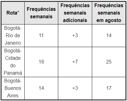 - Em agosto, além do aumento das frequências desta rota, a companhia também terá voos adicionais de Bogotá para Buenos Aires e Cidade do Panamá.