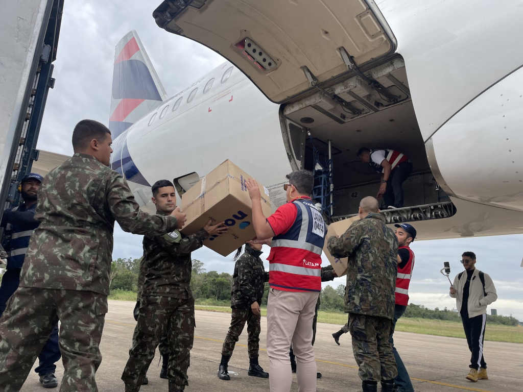 Em cooperação com o Ministério da Defesa e o Ministério de Portos e Aeroportos do Brasil, voo com 3 toneladas e 55 pessoas decolou de Guarulhos (São Paulo) e pousou na Base Aérea de Canoas neste sábado (18); remessa também conta com as primeiras doações vindas de Portugal