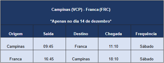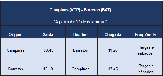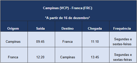 O voo inaugural de Franca para Campinas será realizado dia 14 de dezembro. As operações acontecerão às segundas e sextas-feiras. Já os voos de Barretos começam no dia 17 de dezembro, com decolagens às terças e sábados. Ambos serão realizados em aeronaves Cessna Grand Caravan.