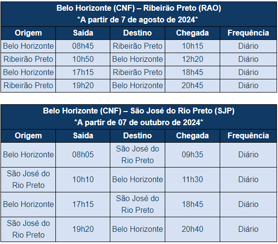 Veja abaixo os horários e frequências dos novos voos da Azul entre Belo Horizonte, Ribeirão Preto e São José do Rio Preto: