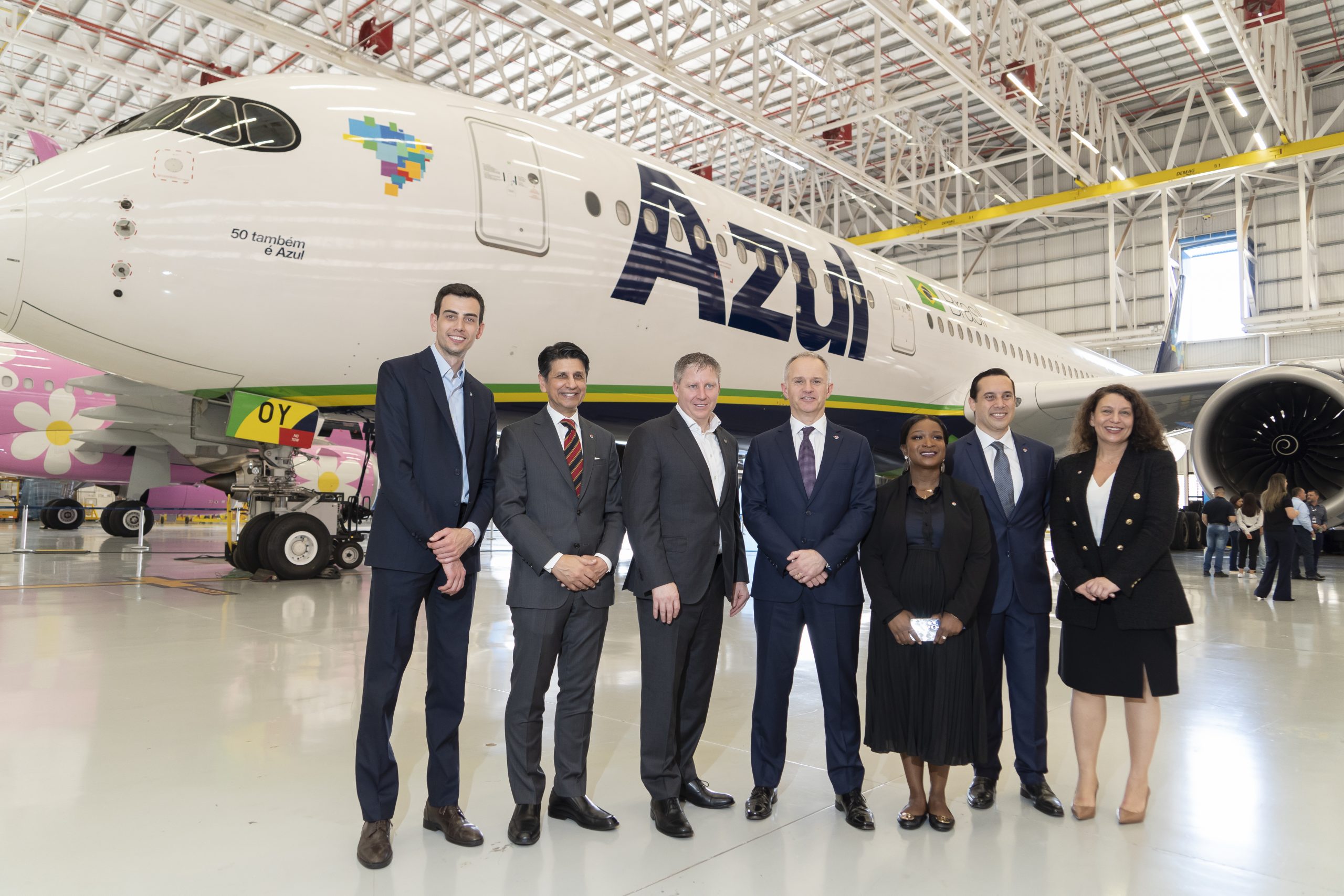 De longe, estacionadas no hangar, as presenças ilustres da menor e da maior aeronave da Azul, um Cessna Grand Caravan e um A350, já anunciavam o motivo da festa em sua fuselagem. As aeronaves foram adesivadas com mensagens para marcar o momento e, principalmente, para compartilhar com os Clientes uma conquista inédita que já é encarada como missão pela companhia: O céu é Azul em ponto! Ganhe tempo, voe Azul _somos a mais pontual do mundo.