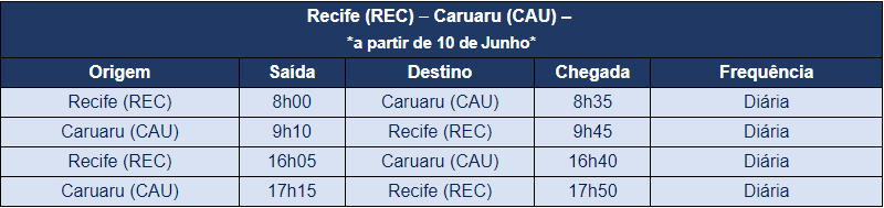O trajeto será realizado duas vezes ao dia, saindo de Recife para Caruaru às 8h00 e às 16h05. Já o retorno de Caruaru para Recife pode ser feito, também diariamente, às 9h10 ou às 17h15. Ao chegar em Recife, os Clientes poderão se conectar a pelo menos 39 destinos no Brasil e no exterior.