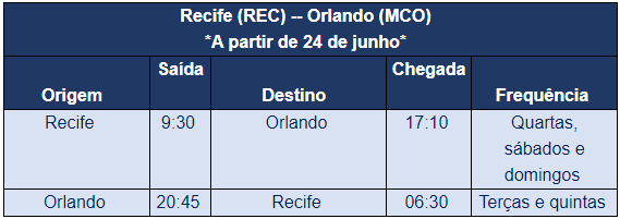 O voo AD8710 decolará de Recife às quartas, sábados e domingos, às 9h30, pousando em Orlando às 17h10. No sentido inverso, o voo partirá de Orlando nos mesmos dias, às 20h15, chegando na capital pernambucana às 6h30.