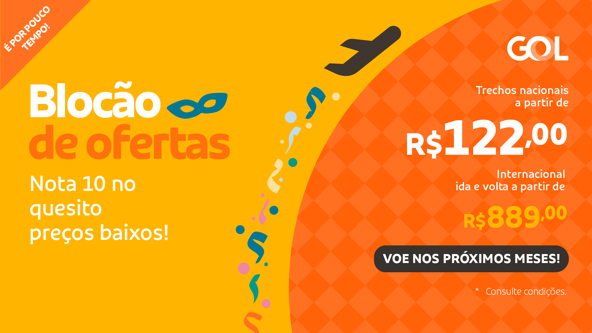 A GOL Linhas Aéreas embarca na festa popular mais famosa do Brasil, o Carnaval, e oferece inúmeras oportunidades para que os Clientes viajem mais, e de forma mais econômica, a partir de agora. O Blocão de Ofertas GOL, que tem início às 18h desta sexta-feira (28) e segue por todo o período da folia, até às 23h59 da terça-feira (4), traz bilhetes domésticos a partir de R$ 122 e viagens internacionais de ida e volta com preços que começam em R$ 889.