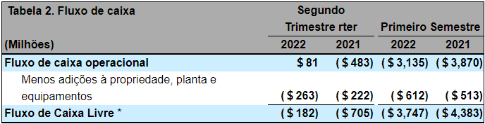 - Fluxo de caixa operacional de US$ 100 milhões. A expectativa de fluxo de caixa livre positivo para 2022 continua