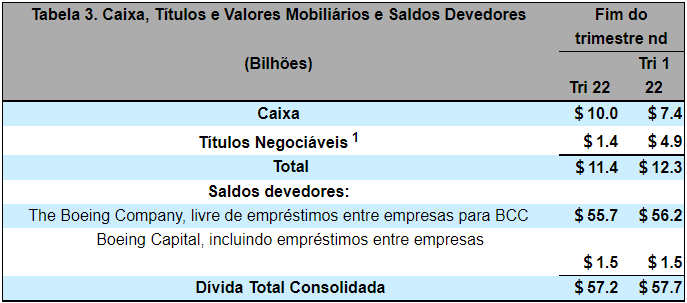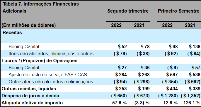 No final do trimestre, o saldo líquido do portfólio da Boeing Capital era de US$ 1,6 bilhão. A alteração no prejuízo de outros itens e eliminações não alocados deveu-se principalmente ao reconhecimento da receita de compensação diferida em comparação com a despesa registrada no segundo trimestre de 2021. A alíquota efetiva de imposto para o segundo trimestre reflete principalmente a despesa de imposto sobre o lucro antes dos impostos e um aumento na dedução de valorização.