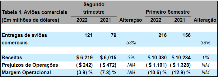 A receita do segundo trimestre para o segmento de Aviões Comerciais aumentou para US$ 6,2 bilhões, impulsionada por mais entregas do 737, parcialmente compensadas por uma redução nas entregas do 787 (Tabela 4). A margem operacional de (3,9) % também reflete custos anormais e despesas do período, incluindo uma alta nas despesas com P&D.