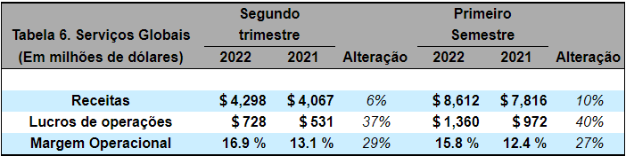A receita de Serviços Globais para o segundo trimestre aumentou para US$ 4,3 bilhões e a margem operacional do segundo trimestre aumentou para 16,9%, impulsionada principalmente pelo maior volume de serviços comerciais e mix favorável.