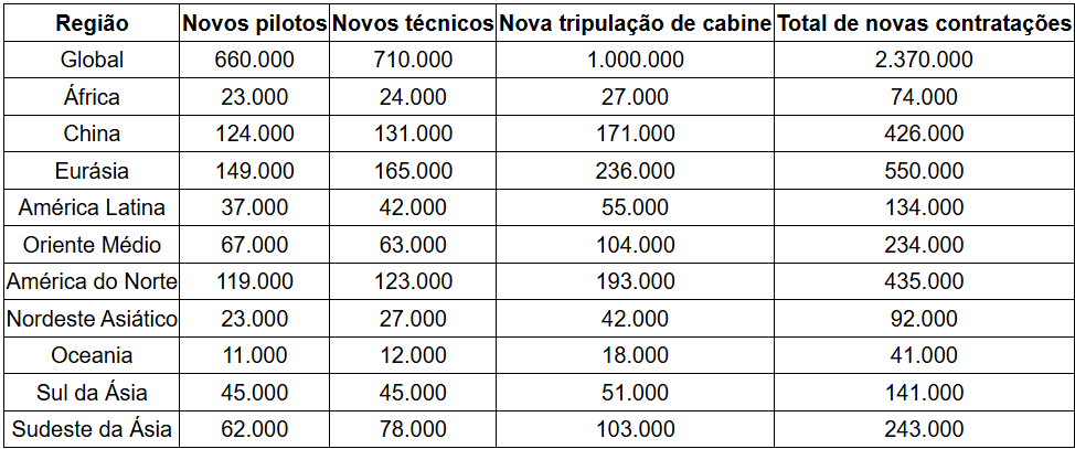 - A demanda por novos profissionais será impulsionada principalmente por aeronaves de corredor único.