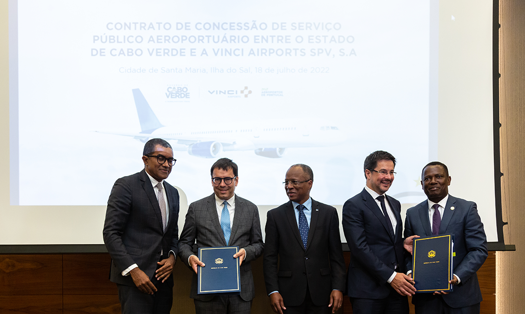 Ulisses Correia e Silva (Primeiro Ministro de Cabo Verde) e Nicolas Notebaert (CEO da VINCI Concessions e Presidente da VINCI Airports) assinaram o contrato de concessão de sete aeroportos no arquipélago de Cabo Verde. O contrato abrange 4 aeroportos internacionais (Praia – a capital -, Sal, São Vicente e Boa Vista) e 3 aeroportos domésticos (São Nicolau, São Filipe e Maio).
