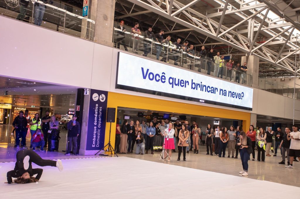 Nesta manhã, a CCR Aeroportos fez nevar no saguão principal do Aeroporto Internacional Afonso Pena, em Curitiba, encantando quem circulava pelo local, que também teve a oportunidade de apreciar uma apresentação dos bailarinos do Festival de Dança de Joinville, inspirada na temporada de inverno na América do Sul.