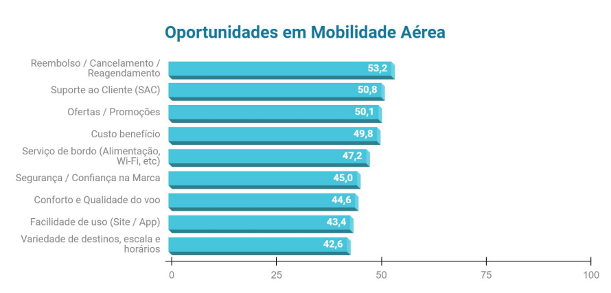O resultado da premiação também mostrou quais as oportunidades de melhorias na mobilidade aérea, por meio da metodologia Jobs to be Done (JTBD), que permite a identificação e priorização dos elementos chave que impulsionam a experiência do cliente. A possibilidade de reembolso, cancelamento e reagendamento (53,2%), suporte ao cliente (50,8%) e ofertas e promoções (50%) foram as oportunidades mais citadas pelos consumidores.