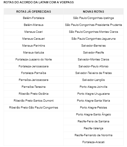 Os 13 novos destinos brasileiros da Voepass disponíveis para os clientes LATAM são: Ipatinga (MG), Barreiras (BA), Feira de Santana (BA), Valença (BA), Paulo Afonso (BA), Teixeira de Freitas (BA), Lençóis (BA), Fernando de Noronha (PE), Uruguaiana (RS), Santa Maria (RS), Pelotas (RS), Santo Ângelo (RS) e Aracati (CE). Atualmente, o acordo de codeshare já permite ao cliente LATAM voar de/para cinco destinos da Voepass no Brasil: Coari (AM), Carauari (AM), Parintins (AM), Itaituba (PA) e Parnaíba (PI).