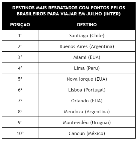 O LATAM Pass também revela os destinos preferidos pelos brasileiros que acumulam pontos/milhas para as férias de julho de 2023. Confira abaixo a lista.