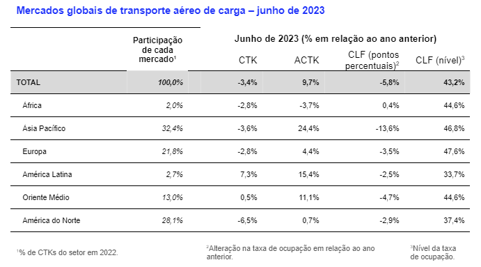 As transportadoras da América Latina apresentaram o melhor desempenho entre as regiões em junho de 2023, com aumento de 7,3% nos volumes de carga em relação a junho de 2022. Esse resultado foi ainda melhor que aquele registrado em maio (+3,8%). A capacidade aumentou 15,4% em junho em relação ao mesmo mês de 2022. No primeiro semestre de 2023, a demanda de carga aumentou 0,9% em relação ao ano anterior, enquanto a capacidade aumentou 18,0%.