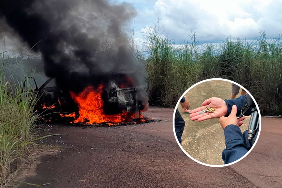 Durante a fuga os criminosos atearam fogo no veículo e abandonaram alguns dos objetos roubados nas proximidades de um residencial e sem seguida fugiram pela mata.