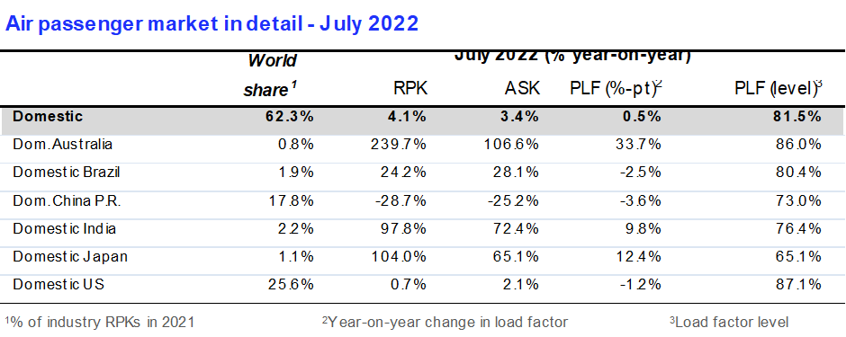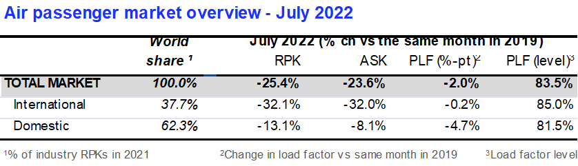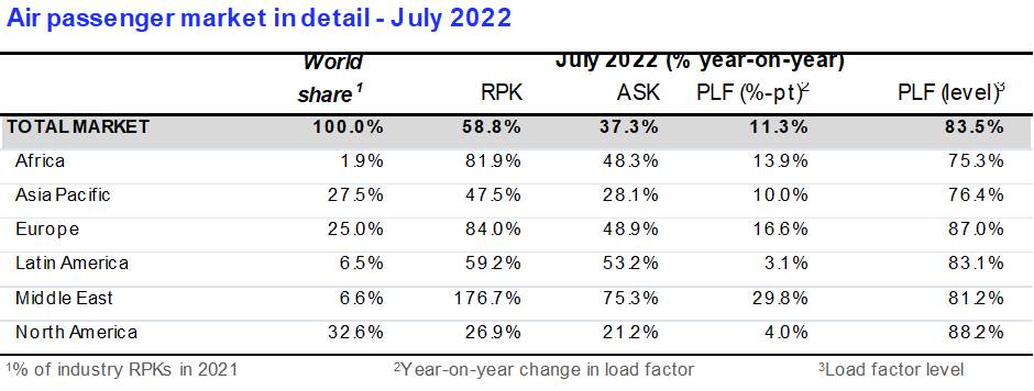 - O tráfego total (medido em passageiro pagante por quilômetro ou RPKs) aumentou 58,8% em julho de 2022 em relação a junho de 2021. Globalmente, o tráfego atingiu 74,6% dos níveis pré-crise.
