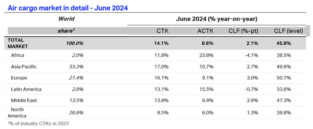 As transportadoras da Europa registraram aumento de 16,1% na demanda por carga aérea em junho de 2024 em relação a junho de 2023. A demanda dentro do próprio mercado europeu aumentou 16,7% em comparação com junho de 2023, o sexto mês consecutivo de crescimento anual de dois dígitos. As rotas Europa–Oriente Médio e Europa–Ásia apresentou aumento de 30,2% e 20,3%, respectivamente. A capacidade aumentou 9,1% em relação ao ano anterior.