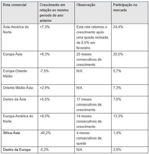 Crescimento das rotas comerciais: A rota Europa-América do Norte foi a rota comercial mais movimentada em março. A rota Ásia-América do Norte, a maior rota comercial em participação de mercado, também apresentou forte crescimento, possivelmente impulsionada pela antecipação da demanda devido aos possíveis aumentos de tarifas. As rotas Europa-Oriente Médio e África-Ásia foram as únicas rotas comerciais com queda em março.