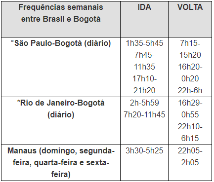 Cerca de seis horas separam os viajantes de São Paulo e Rio de Janeiro de Bogotá, enquanto a distância da capital amazonense é de apenas três horas. O hub da companhia aérea possibilita conexões imediatas para outros 17 destinos colombianos, com voos que giram em torno de 58 minutos e 2 horas.