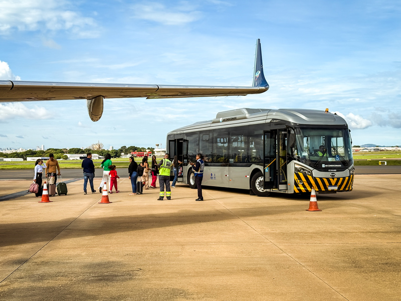 O Aeroporto Internacional Santa Genoveva, em Goiânia (GO), é o primeiro do Brasil a operar regularmente um ônibus 100% elétrico para o transporte de passageiros. Após completar uma fase de testes iniciada em julho, o modelo D9W, da BYD, entrou em operação definitiva, transportando cerca de mil pessoas diariamente entre o terminal e as aeronaves. A iniciativa é resultado de um acordo firmado com a CCR Aeroportos, concessionária que administra 17 terminais no Brasil.