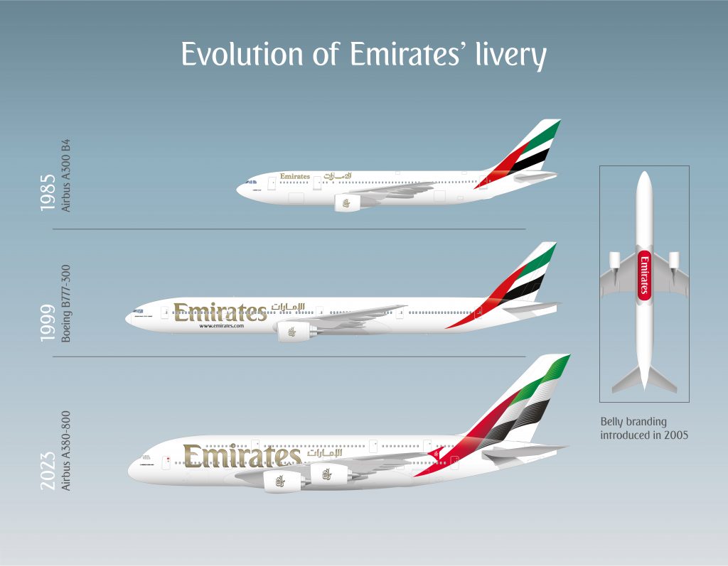 Esta é a terceira atualização das cores oficiais da marca nas aeronaves da Emirates. A pintura original exibida no lançamento da companhia aérea em 1985 teve sua primeira atualização 14 anos depois, com a entrega da primeira aeronave Boeing 777-300 da Emirates no Dubai Airshow de 1999.