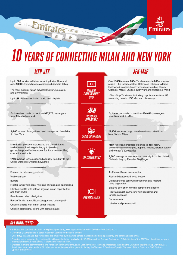 Completando o seu décimo aniversário de serviços entre a “capital mundial da moda” e a cidade mais visitada dos EUA, os voos da Emirates transportaram mais de 37.000 toneladas de carga entre Milão e Nova Iorque, com exportações de Itália que vão desde vestuário, a alimentos e joias. Dos EUA, o vestuário, os têxteis, as peças sobressalentes, bem como os produtos químicos utilizados em diversas indústrias estão no topo da lista de produtos frequentemente exportados para Itália. Em média, a divisão de carga da companhia aérea, Emirates SkyCargo, facilita anualmente as exportações entre os dois gateways, totalizando quase 4.000 toneladas de carga. Isto demonstra ainda mais o compromisso da Emirates em apoiar as economias locais e as empresas comerciais em ambos os países.
