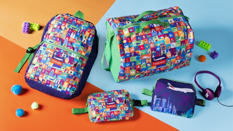 Para os clientes mais jovens da Emirates, as sacolas de brinquedo gratuitas da companhia aérea, os kits de amenidades para bebês e os brinquedos de pelúcia também são feitos de garrafas plásticas recicladas e outros materiais sustentáveis. Sacos de cinto, sacos de duffle e mochilas são projetados com faixas etárias específicas em mente e são construídos a partir de um fio que é feito de garrafas plásticas 100% recicladas. Cada mochila infantil da Emirates é feita de 5,5 garrafas plásticas recicladas e cada saco de pano é feito de 7. A produção das sacolas infantis da Emirates salvou 8 milhões de garrafas plásticas de aterros sanitários. As etiquetas de balanço são feitas de cartão reciclado, e até mesmo as caixas externas em que os produtos são enviados são feitas de cartão reciclado que pode ser reciclado novamente.