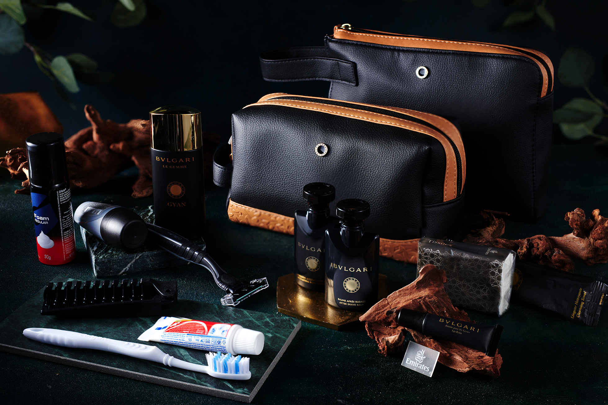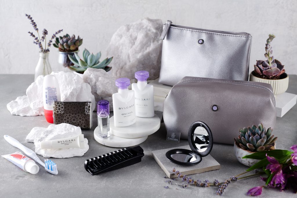 Mantendo o compromisso da Emirates de oferecer uma experiência excepcional ao cliente a bordo, as sacolas de kit da Primeira Classe e da Classe Executiva apresentam novos pantones e designs de tendências, juntamente com fragrâncias Bulgari encapsuladas em frascos projetados exclusivamente para a Emirates. A nova linha apresenta oito bolsas colecionáveis diferentes na Primeira Classe e na Classe Executiva, em tecido clássico bege e preto, prata contemporâneo com lilás ou preto discreto com destaques lilás.