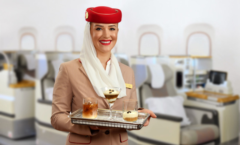 Os tripulantes de cabine da Emirates recebem treinamento especializado em café, onde aprendem sobre as origens do café, diferentes blends e como fazer a xícara perfeita para cada cliente. Em sessões de treinamento prático, a tripulação de cabine aprende como servir e apresentar cada tipo de café e é avaliada na preparação e entrega do café árabe exclusivo da Emirates. Os passageiros da Primeira Classe podem desfrutar de seu café em uma caneca ou xícara de osso fino Royal Doulton, e os passageiros da Classe Executiva na caneca de porcelana fina. A qualidade da água utilizada para fazer o café também é considerada e monitorada regularmente, e a Emirates garante que as caixas d’água, equipamentos utilizados para transporte e linhas de abastecimento forneçam água perfeitamente potável, por meio de desinfecção, manutenção e auditorias regulares.