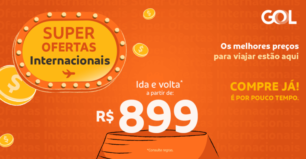 Durante o Feirão GOL de Super Ofertas Internacionais, as passagens promocionais estão disponíveis no website e app da GOL, agências de viagem, central de relacionamento com Clientes (0300 115 2121) e lojas VOEGOL. Não é válido para compras em lojas de aeroportos.