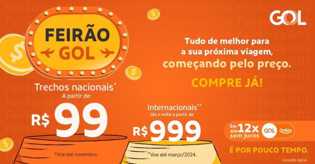 Neste fim de semana, a GOL Linhas Aéreas, maior Companhia Aérea do Brasil, lança mais um Feirão GOL de passagens aéreas. Os descontos serão praticados ao longo dos próximos dias, permanecendo vigentes até domingo (20), às 23h59. Uma ótima chance de se programar agora para voar de forma mais acessível até novembro de 2023, em rotas nacionais, e até março de 2024, nas internacionais. Trechos domésticos saem a partir de R$ 99, enquanto as viagens internacionais começam em R$ 999 (ida e volta).